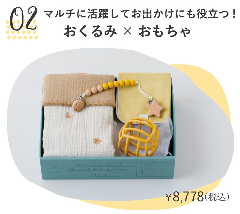 おくるみの色味に合わせておもちゃやハンカチをセレクト。おもちゃや歯固めとして使えるシリコンボールや、ベビーカーとおもちゃを繋いだり、ハンカチの両端を留めるとスタイにも早変わりするストラップなど、かわいいだけでなく赤ちゃんとのお出かけ時にもとっても便利なギフトセットです。