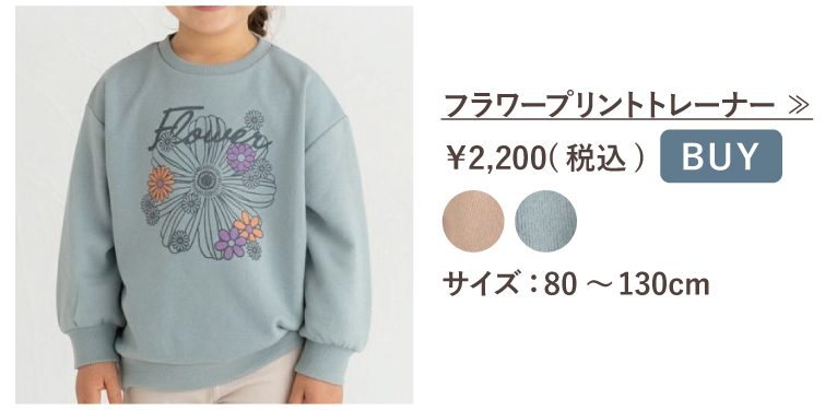 程良くゆるっとしたシルエットのプリントトレーナーはお花がたっぷり描かれた、可愛さ満点の女の子らしいデザイン♪ユースフルに使える裏毛素材です。優しいパステルトーンのカラーリングでお手持ちのボトムとの合わせやすさも◎お着替えで負担がかかりやすいネック周りはリブ仕様にしています!