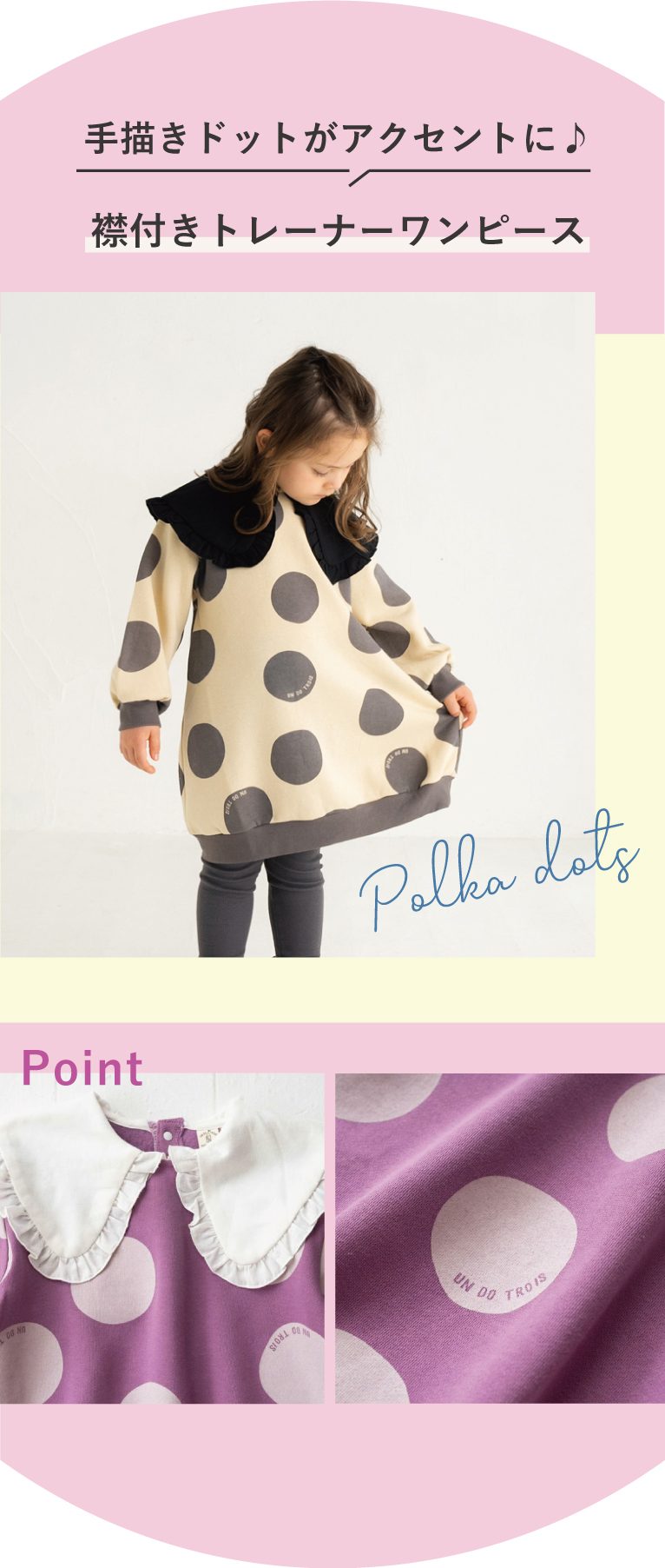 大きめのフリル襟ブラウスをレイヤードしているようなドッキング仕様でカジュアルな装いにおしゃれなきちんと感をプラス。大きなドット柄が1枚でおしゃれなコーデにしてくれます。裏起毛で寒さ対策もバッチリ!