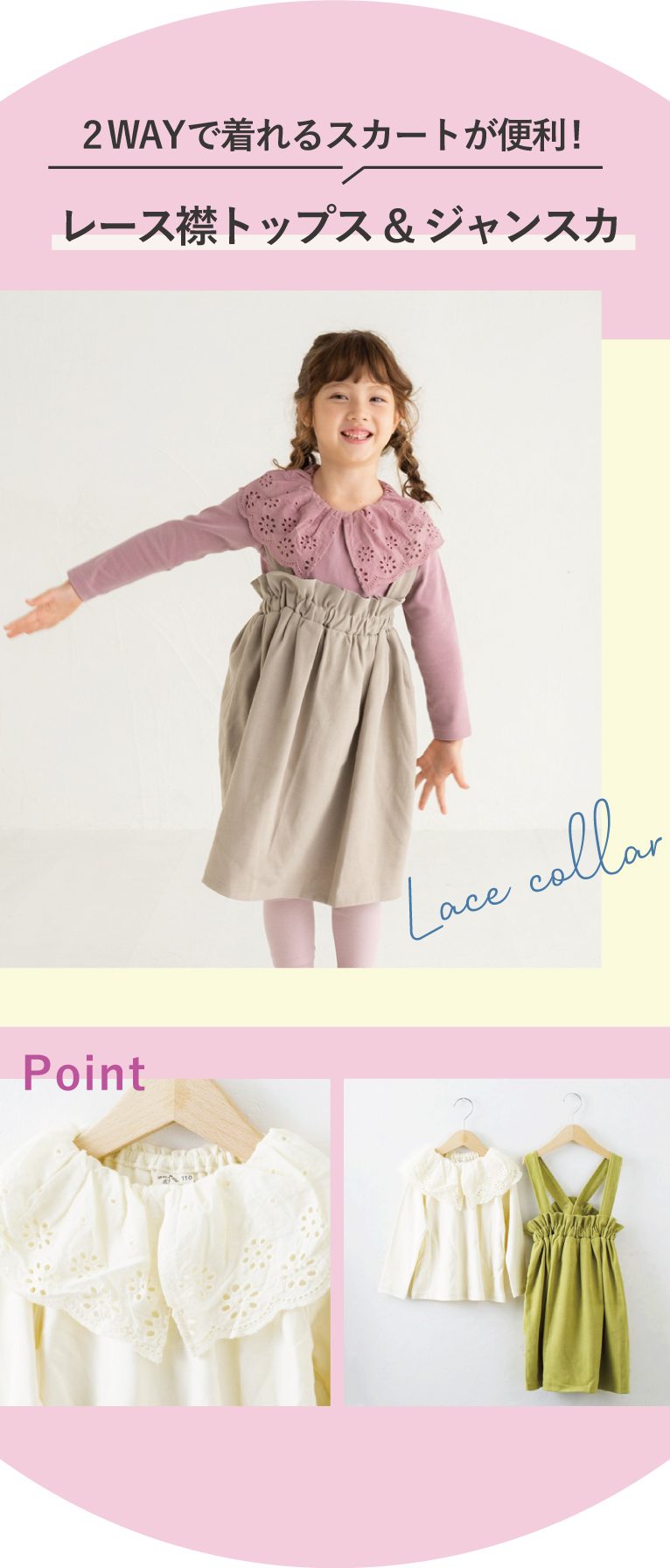 大きなラウンドフリルのレース襟がかわいいトップスとジャンスカのセットです。ジャンスカの肩ベルトは長さ調節が可能なので長く愛用していただけます。肩ベルトを取り外してスカートとして着用も可能!ちょっとしたフォーマルウェアとしても着られて便利◎