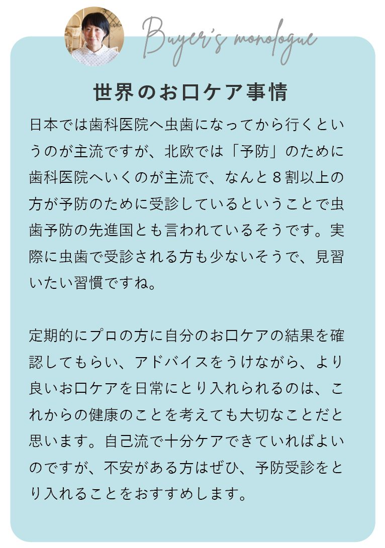 予防受診もおすすめですが、一番大事なのは日々の「歯磨き」です。お口の健康は気になり出してから…というのではなく「予防」を意識して、自分に合った歯磨きを歯磨きツールとともにアップデートしていきましょう。