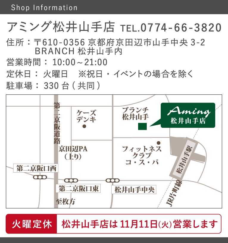 一部店舗改装に伴い、アミング松井山手店は下記の4日間お休みをいただきます。