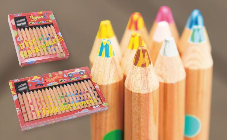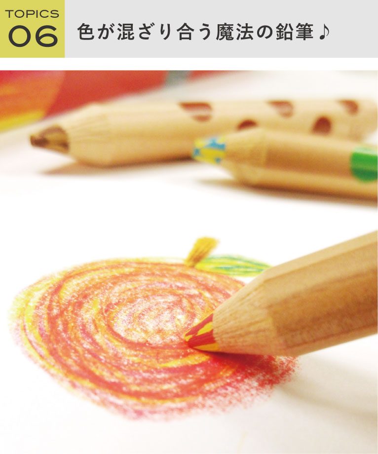 「ミックス色鉛筆」は、絵本作家が厳選した2つの色を1本の芯に収めた混色芯を採用した新しい色鉛筆です。手軽に美しい色の重なりを楽しむことができます。
