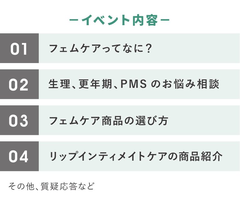 人生をより健やかに自分らしく生きるためにはデリケートゾーンを健康的に保つことが大切です。フェムテックへの注目が高まる中、女性の心や身体の変化について自分自身を大切にケアし、心身ともに健やかに快適に生きていくためのヒントを見つけていただけたら嬉しいです。ぜひ、ご参加ください。