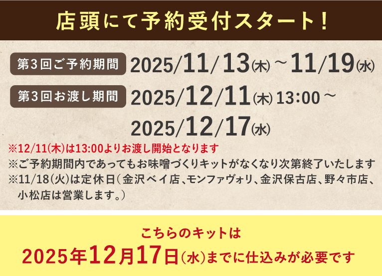 ※ご予約期間内であってもお味噌づくりキットがなくなり次第受け付けを終了いたします