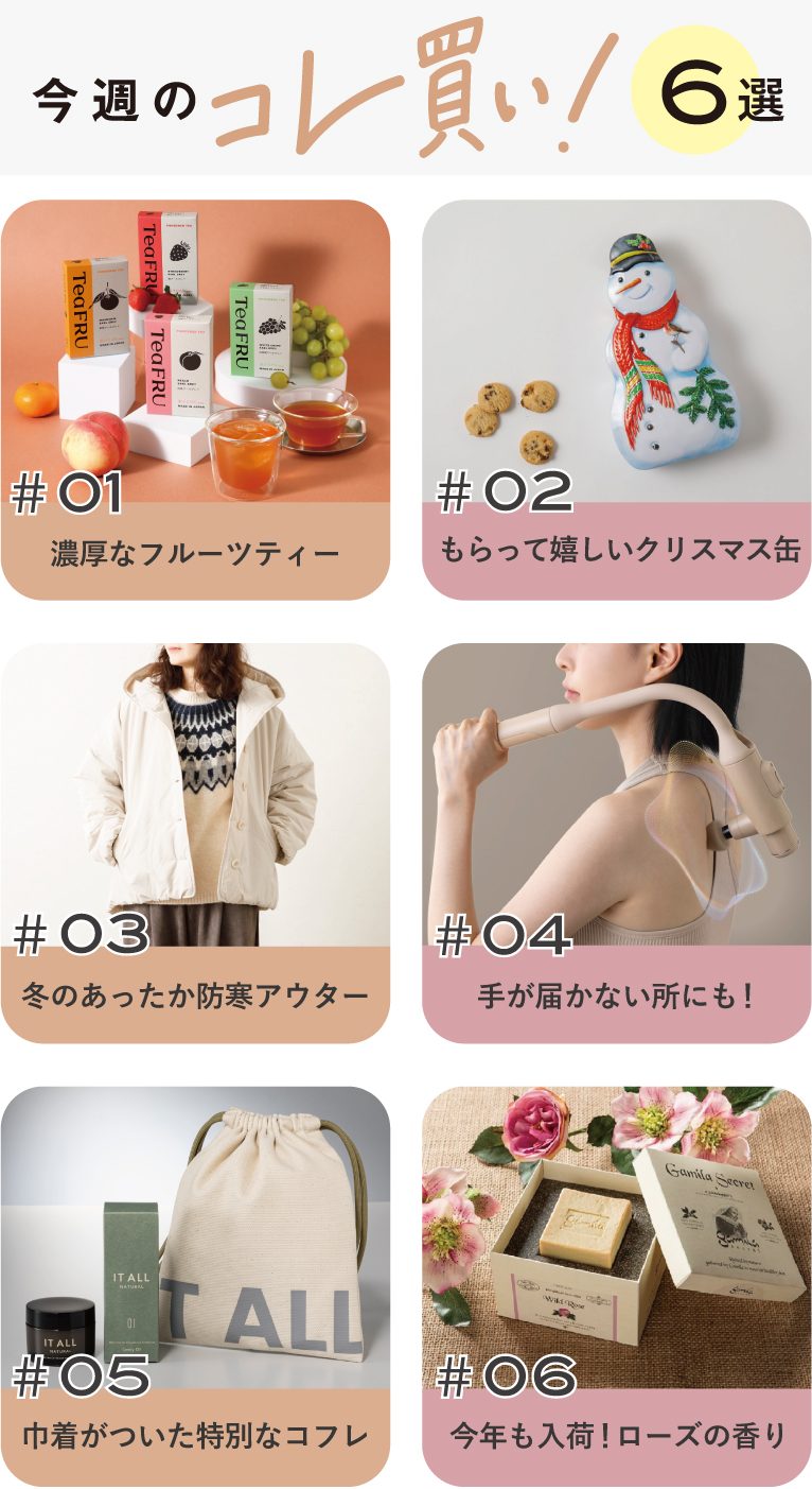 フルーツ香る「TeaFRU」やリラックスタイムにおすすめの「ルルドガン プラスアーム」、いつものケアがちょっと特別になる「IT ALL NATURAL」の限定コフレなど、もらって嬉しいアイテムをピックアップ!