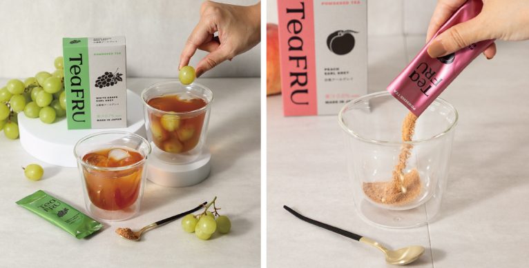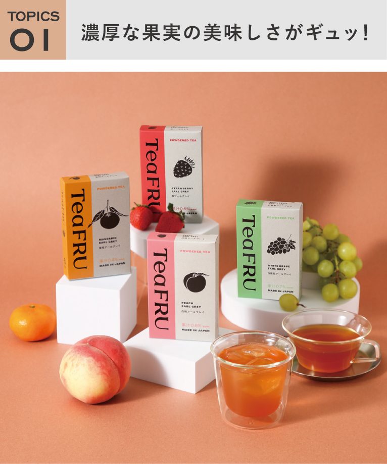 「TeaFRU(ティーフル)」のベースとなるのは、華やかな香りで世界中に愛されるアールグレイ。香り高い味わいそのままにパウダー化し、そこに本物のフルーツパウダーがブレンドされています。