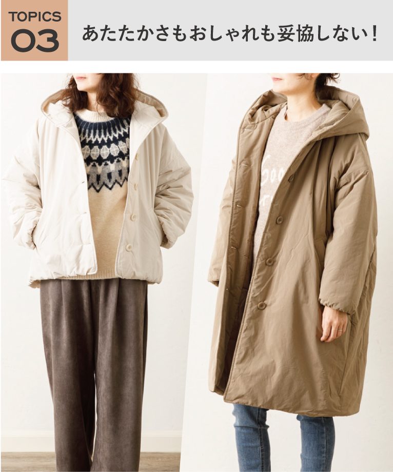 寒い季節もおしゃれに楽しめる防寒アウター。軽やかな着心地なのにしっかりあたたかく、いつものコーデにプラスするだけで季節感アップ♪