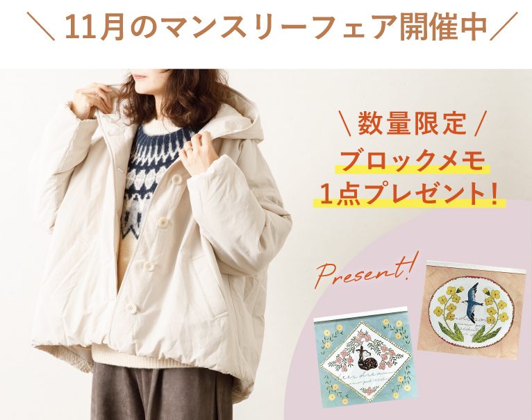 防寒アウター&ニットのいずれか1点を含む大人のお洋服を¥20,000(税込)以上ご購入で「ブロックメモ」を 1点プレゼント!