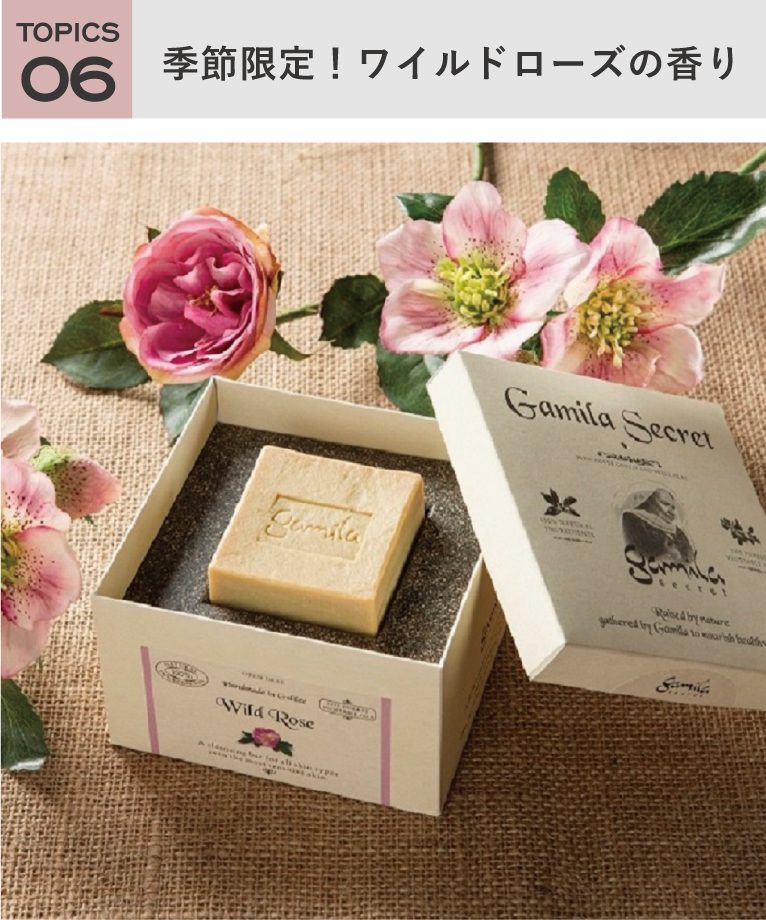 バラの女王とも言われるダマスクローズを配合したソープ。15種類の植物をベースに、エクストラバージンオリーブオイルを80%使用しているから、必須ミネラルやビタミンがたっぷり♪