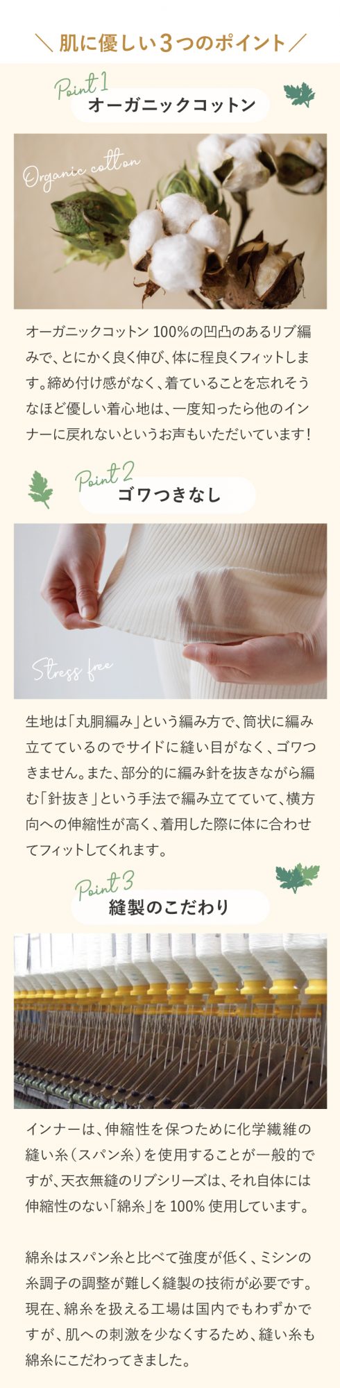 『天衣無縫』のリブインナーは、職人さんの手によって一つひとつ丁寧につくられていて、リピーター様も多いシリーズです。身に着ければ、その気持ち良さを感じていただけます。