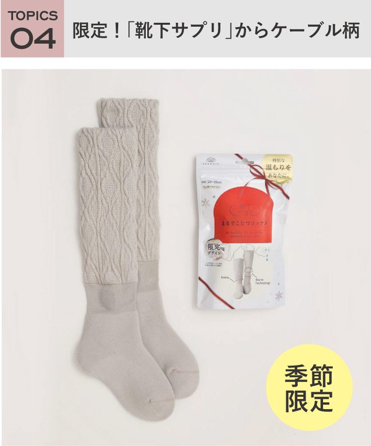 まるでこたつのようなあたたかさとやわらかさが魅力の「まるでごたつソックス」に、新しく「ケーブル柄」が登場しました!