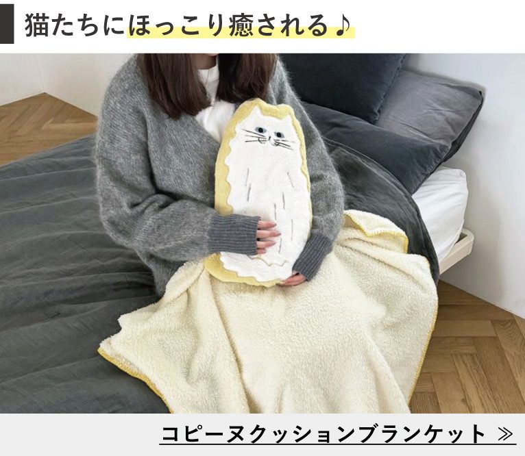 中のブランケットは膝にかけたり肩から羽織ったりするのにちょうど良いサイズ感。クッションとして置くだけで、まるで猫がそっと佇んでいるようなかわいらしい雰囲気を楽しめるのが◎