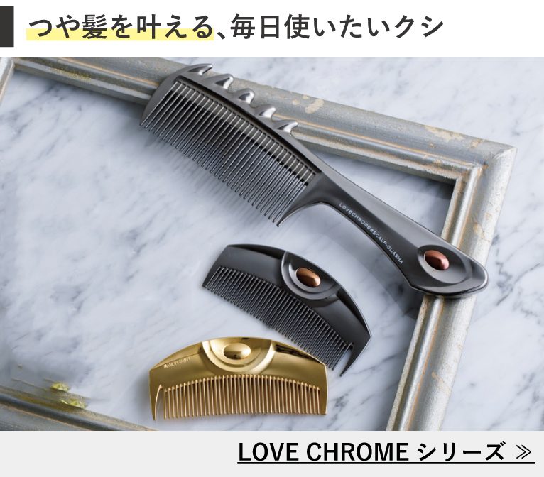 「LOVE CHROME(ラブクロム)」は日本の工業技術「JP CHROME-TECH(R)」を活用し、日本の職人技で加工した表面はとてもなめらか。接触によるダメージを軽減し、美しいツヤ髪へと導きます。毎日のコーミングを特別な時間にしてくれる、上質なコームがラインナップしています。