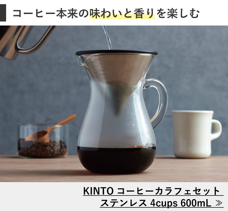 ハンドドリップで淹れたコーヒーをゆったり味わえる、柔らかなフォルムが魅力のカラフェ・ステンレスフィルター・ホルダーのセット。