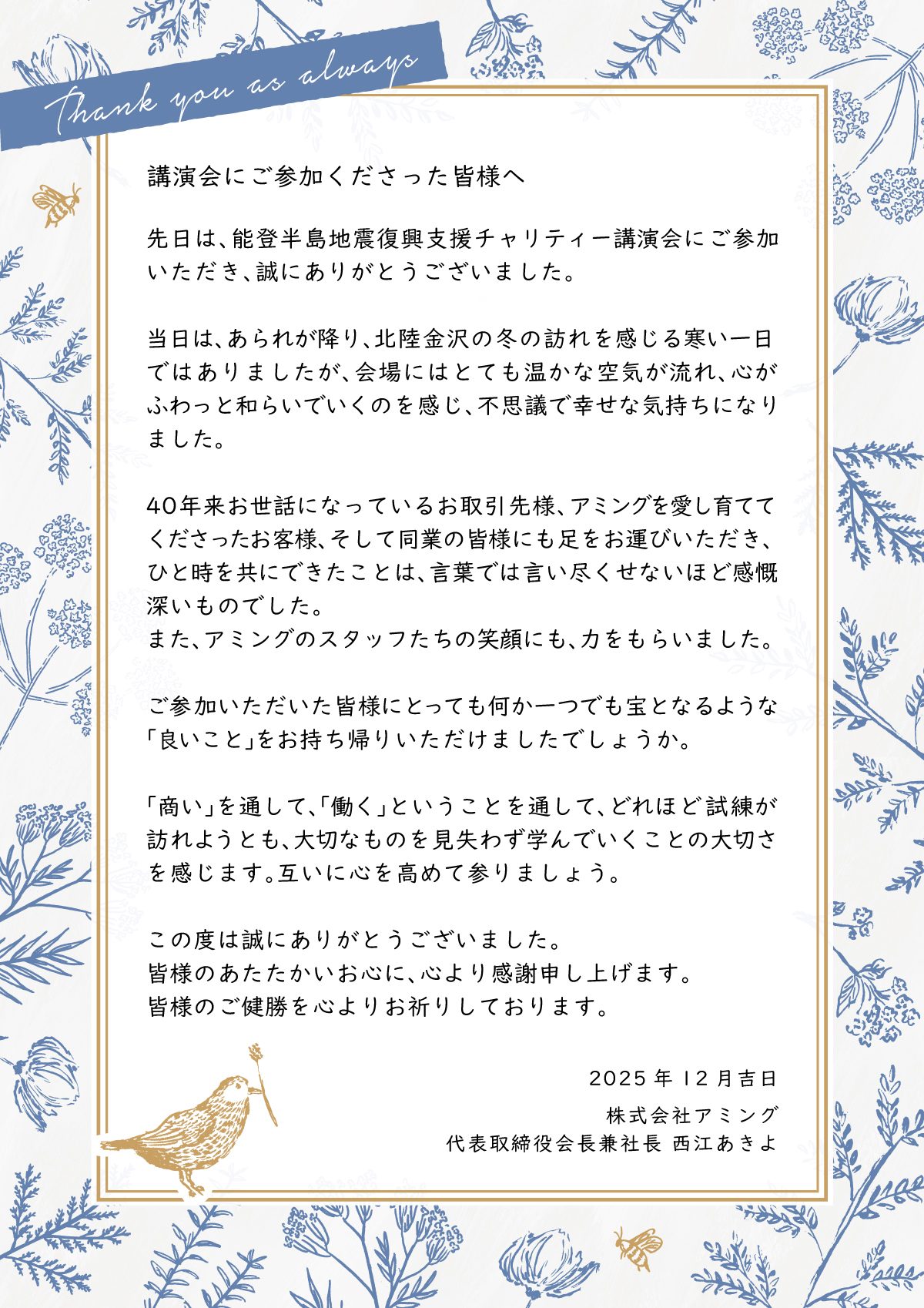 当日の内容が、皆さまの暮らしやお仕事の中で少しでもお役に立てましたら幸いです。また、代表から皆さまへお届けする御礼の手紙を添付しております。お時間のある際にご覧いただけますと嬉しく存じます。今後とも、変わらぬご支援・ご交流のほど、どうぞよろしくお願い申し上げます。